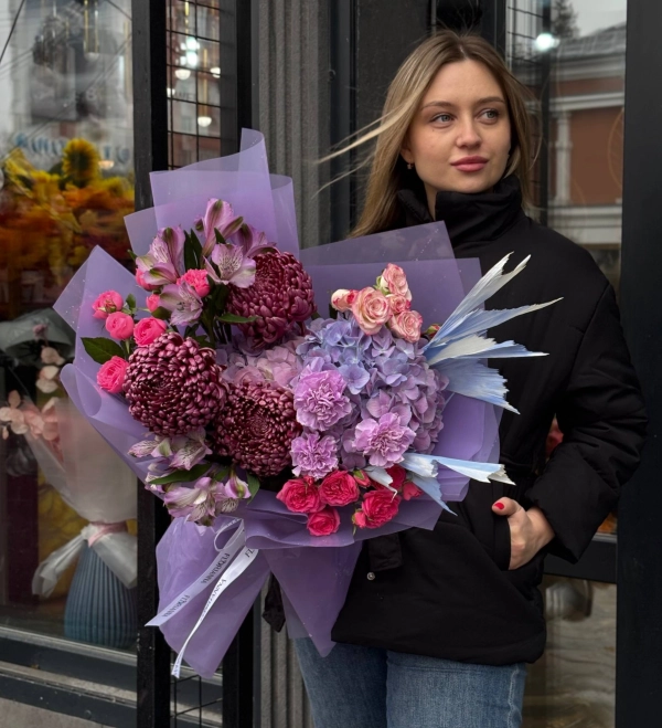 Стильная лавандовая упаковка подчёркивает насыщенные оттенки и делает букет роскошным и выразительным. Идеален для особого повода или эффектного подарка.
